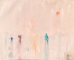 “Reflections” is about perception, memory, and the passage of time. Faintly colored figures emerge from the pale background. They seem to be caught between material reality and memory. The composition emphasizes space and the relationship among the figures.